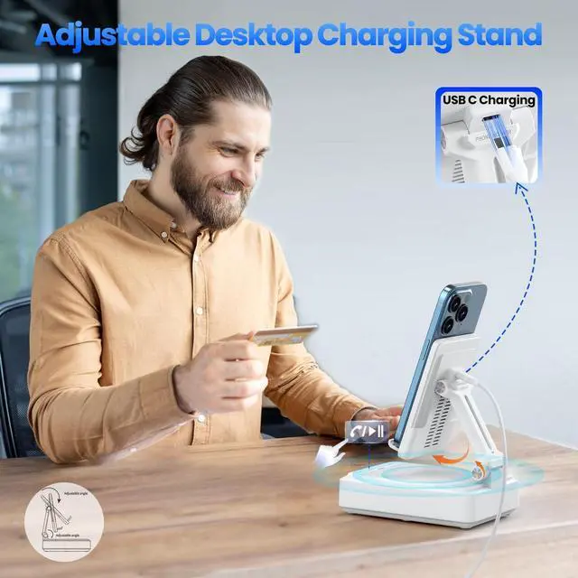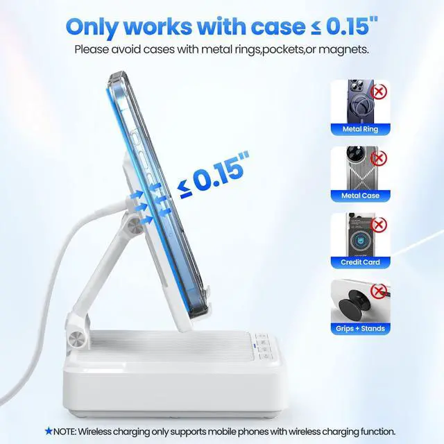 3-IN-1 Practical Speaker Charging StandThis practical wireless charging stand perfectly integrates the functions of wireless charging, Bluetooth speaker and mobile phone stand, reducing the accumulation of desktop devices and making the desktop more concise and orderly. Charging, listening to music and watching videos can be completed simultaneously, while freeing your hands and improving work and entertainment efficiency. It is a practical and thoughtful gift for men and women, dad gift and mom gift. ^^ Stable and Safe Wireless Charging Built-in multiple safety protections and dual-coil design. The phone can be wirelessly charged whether placed horizontally or vertically.