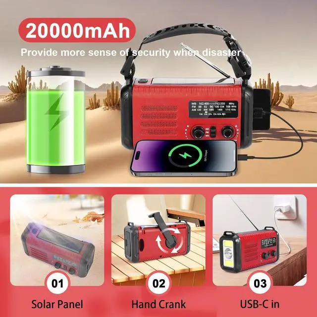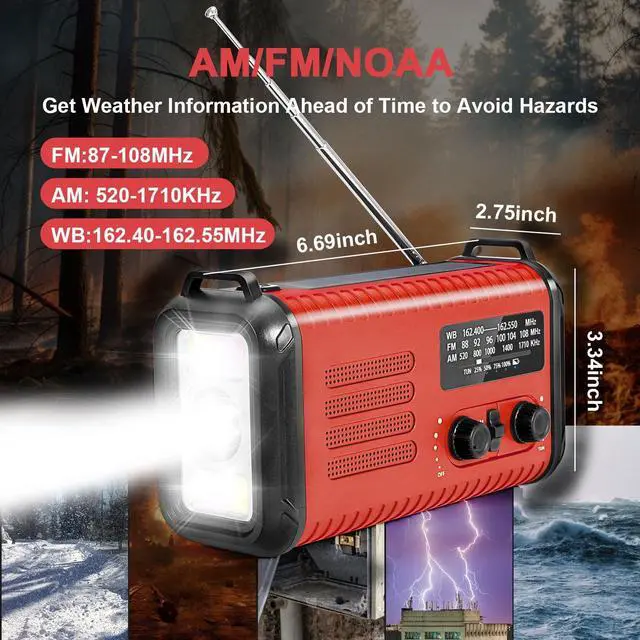 NOAA Weather Radio Keeps You Prepared AheadAs disasters surge, an exceptional emergency radio becomes a necessity, The emergency crank radio with weather band and phone charge professionally get weather broadcasts the latest weather and all hazard information for your areas like hurricanes, tornadoes and so on from 7 NOAA stations at a crystal-clear sound. Earns a critical time for you to get full preparation advance, keeping you and your family safe with this emergency weather radio. ^^ 5000mAh Ultra Capacity Emergency Radio Revolutionize your emergency preparedness with our 50000mAh Solar Radio! This weather radio comes with 5000mAh large-capacity rechargeable battery and solar panels, USB charge, Solar charge, Hand-crank could also supply the emergency radio last for days after the storm had passed until the power back on.