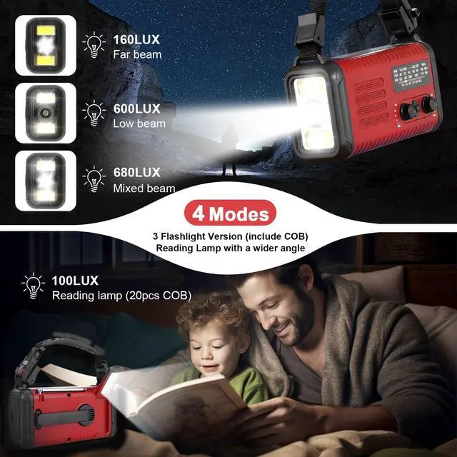No matter what emergency situation you find yourself in, this hand crank radio that you will never be without power, ^^ All-in-One Portable Radio with LED Flashlight/Reading LampOur hand crank radio is also designed for outdoor survival- provides 2 light sources with 3W LED flashlight can provide light to a wide area and better vision when you need to move at night or power failure. 2.5W Reading Lamp to illuminate room or campsite while camping. Emergency radio can as a power bank charge your cell phone or portable device for calling for help in emergency, such as thunderstorm, hurricanes.