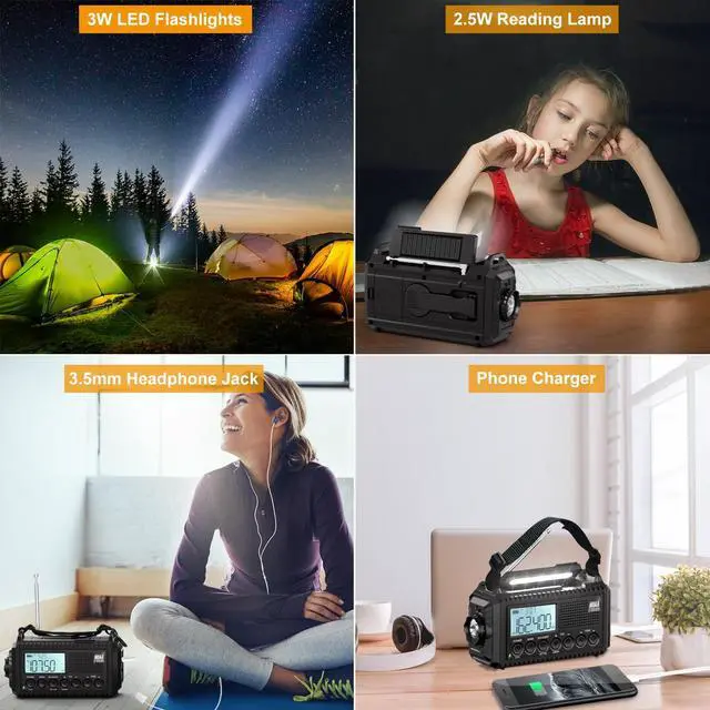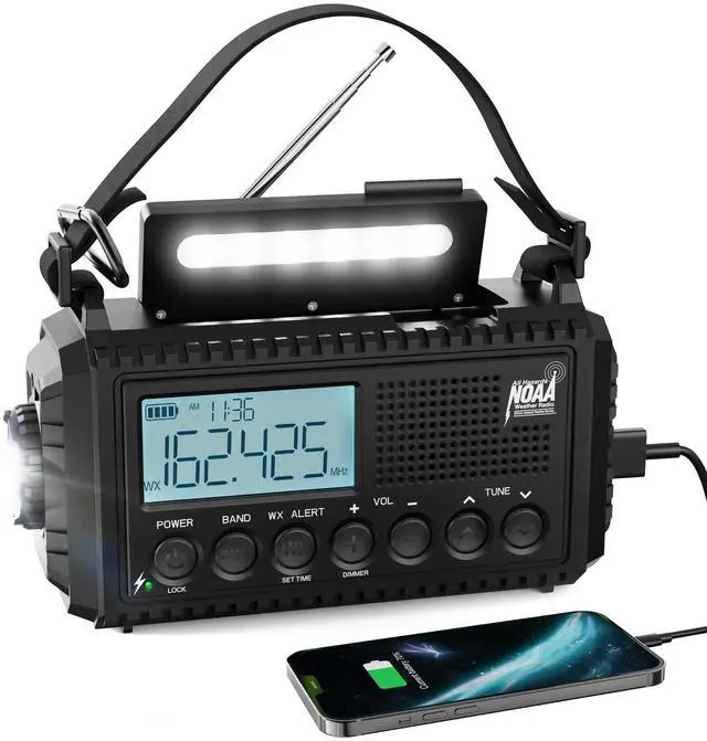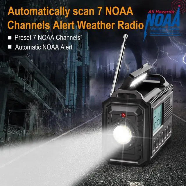 ^^ EMERGENCY RADIO & SOS ALARM - When hurricanes, tornadoes, earthquakes, flooding, or other emergencies may occur, an NOAA alert radio can provide life-saving information. A built-in super-bright 3W flashlight and 2.5W reading lamp are critical if the power outage. It also includes a USB connector used to charge your USB-enabled smart devices for communication. Simply press the SOS button that activated a loud alert partnered with an eye-catching flashing red light for emergency assistance. ^^ PORTABLE RADIO & HEADPHONE JACK - This portable radio is small, light, and IPX3 water-resistant, only 1.2LB, measures: 6.83. 72.9 inches, which is easier to carry with you anywhere. Includes a 3.5 mm headphone jack, allowing you to listen to the weather broadcast at night without disturbing your travel buddies. Weather alerts are beneficial during outdoor adventures like fishing, camping, and hiking, can keep you well-prepared for severe weather and stay safe.