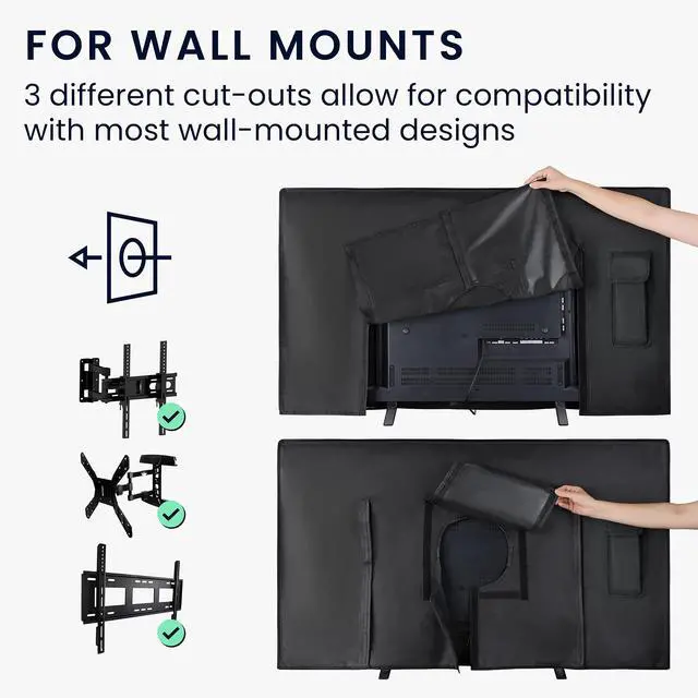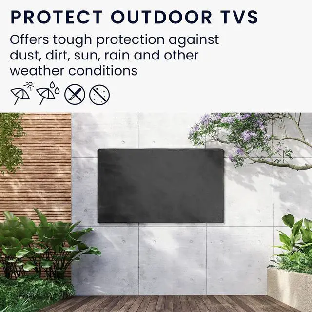 PERFECT FIT: The moisture- and scratch-resistant screen cover is compatible with most wall mounted TVs. The velcro closure gives you the peace of mind of a secure waterproof TV cover for outside Product Information 1x Outdoor Waterproof Weatherproof TV Cover NOTE: Our TV protector for outside doesn't cover the underside of the television or guard against extreme hot and cold temperatures, hail or heavy impact. In these cases it's best to bring the TV inside