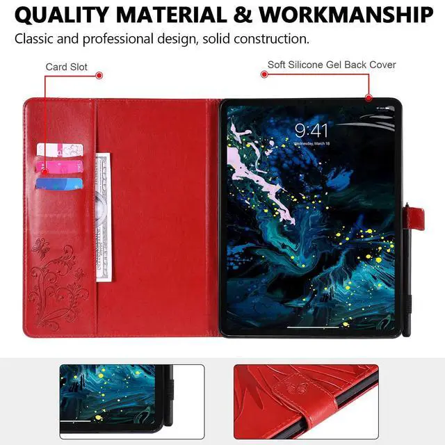 NO cut-out for charging the Apple Pencil. The soft back cover is easy to remove and install without damaging your device. You can hold the stylus in the elastic loop. ^^ Snug fit & protective. Premium synthetic leather exterior & soft shock-absorbing TPU inner cover, provide full protection for corners and sides against bumps and scratches. ^^ Secure magnetic clasp keeps the front cover sealed; doesn't support Wake/Sleep mode. Fold back easily and is able to set up a stand position for watching movie or FaceTime chatting. ^^ Built-in 3 card slots and 1 side pocket to put credit cards, ID, business card, cash or bills, perfect for outdoor activities.