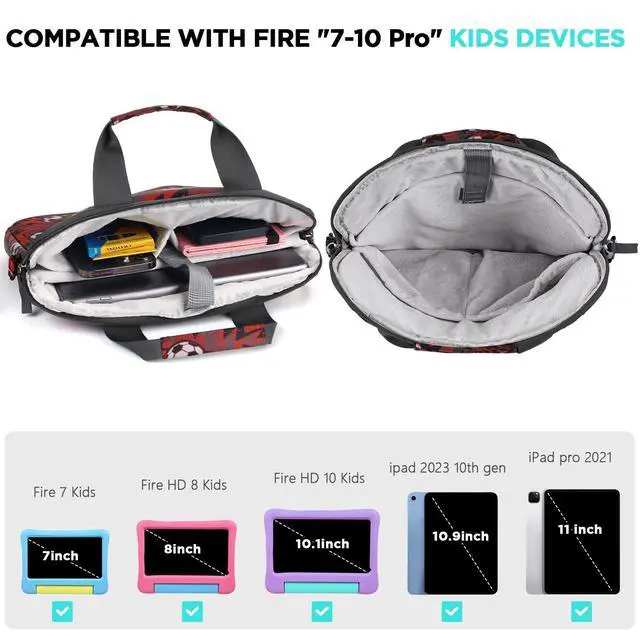 Dimension: 13 X 9.8 X 1.3 inches, inner sleeve fits up to 11.8 inches, with Shoulder Strap, fits most standard tablets 8-10". Easy to carry. ^^ Zipper closure, Water-resistant polyester. Tablet bag for kids, Compatible for Fire Kids Edition, Fire HD 10 Pro, Fire HD 8 Pro, Fire 7, Kindle, chromebook tablet, samsung tablet, android tablet, e-readers. Also fits iPad 10.2 (7th/8th/9th gen) & iPad mini ^^ Kids tablet accessories, fit for tablet 8-10inch. Padded sleeve and soft lining help protect from bumps and scratchesgreat for daily use by kids. ^^ Tablet pouch for child, headphones charging cables, and more. Front pocket keeps charger, cables, earbuds/headphones, stylus and small essentials organizedno more lost accessories. ^^ Practical tablet bag for kids for boys and girlsperfect gift for kids (birthday, Christmas, back to school, travel). A smart everyday tablet case bag parents will love.