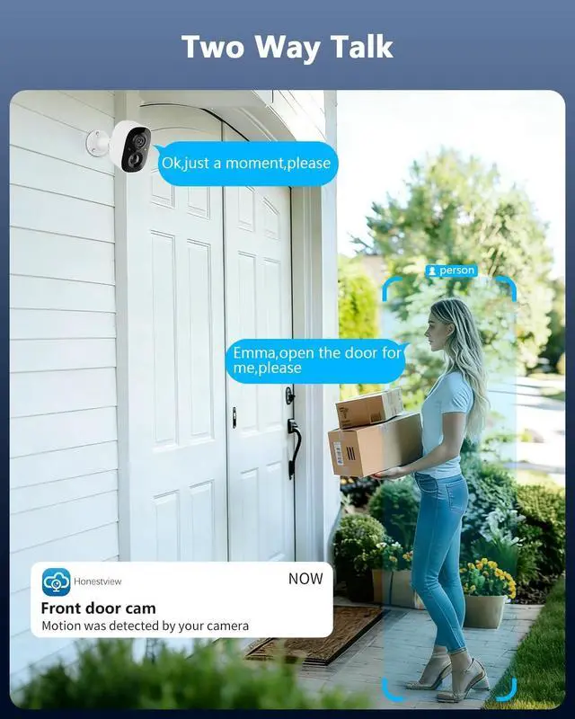 ^^ {4MP Color Night Vision} The wireless security camera delivers 4MP crystal-clear video day and night. With 25601440 resolution, four times sharper than 1080p camaras. This camera features CMOS image sensor, automatically switches between color and IR modes to capture clear images even in complete darkness. ^^ { 2.4GH z & 5GHz Dual-Band WiFi} Experience seamless HD streaming and expanded coverage with dual-band WiFi supportthe 2.4GH z delivers extended signal range through walls, while the 5GHz ensures ultra-fast, stable video transmission. ^^ {Free APP No Month Fee} Download the free app "Honestview" from App Store on your smartphone.
