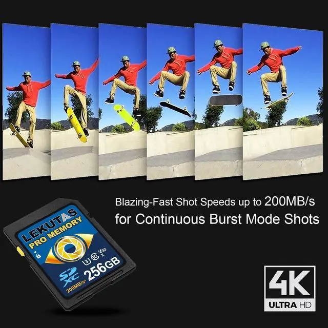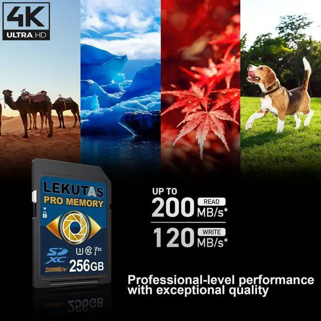 Non-Stop Shooting and Transfers in a Blink Read speed up to 200MB/s and write speed up to 130MB/s. Spend less time transfering means more time creating. You will NEVER miss a shot. ^^ Perfect for Shooting 4K UHD Video Features U3 and V30 ratings with A2 performance that helps with fast loading and 4K UHD video capture and sequential burst mode photography. (Full HD (1920x1080) and 4K UHD (3840 x 2160) video support vary based upon host device. ^^ Adapts To Wide Range of Needs Whether using DSLR, Mirrorless Camera or PC, count on the LEKUTAS SDXC card for extensive compatibility.
