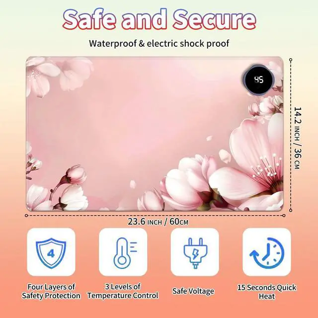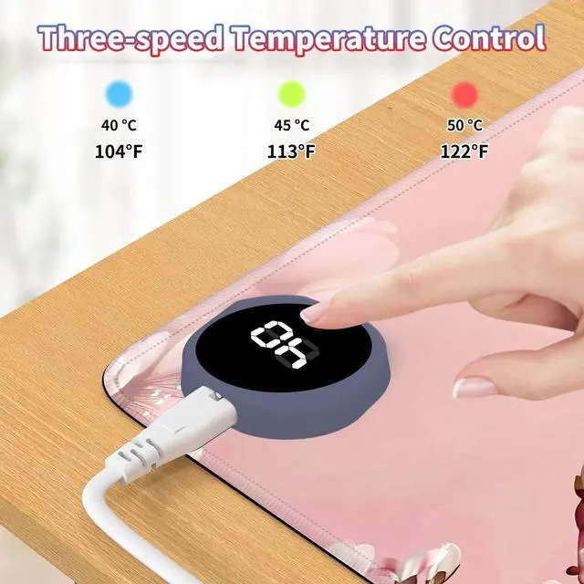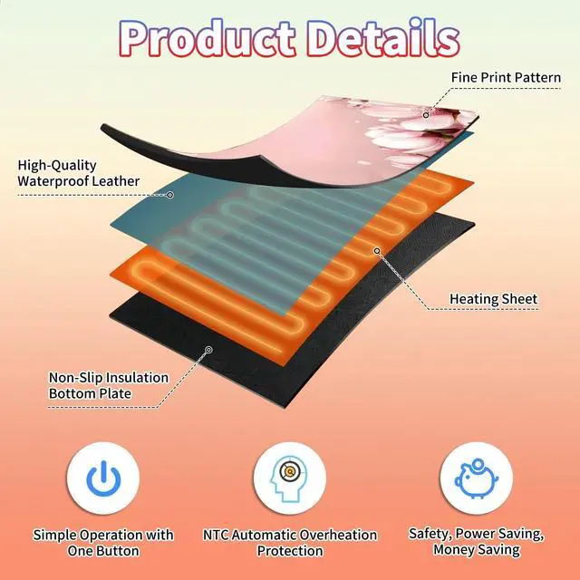 Are You Tired of Having Cold Hands While Working or Gaming? Select BPQOJB Heated Desk Pad is here to keep you warm and comfortable Whether You're Working, studying or gaming, Heated Mouse Pad ensures you stay cozy and productive all winter long Fast Heating with 3 Adjustable Levels Heated Desk Mat with 3 temperature settings: Low (40C / 104F) for gentle warmth Medium (45C / 113F) for consistent comfort High (50C / 122F) for a quick boost of heat Desk Hand Warmer Simple touch control lets you switch between levels effortlessly, You can set it to the right warmth. just seconds, feel the heat and say goodbye to cold hands, wrists, and arms Auto Shut-Off Design Mousepad warmer includes 1, 2, and 4-hour auto shut-off timers. Long-press the power button until it flashes to activate. helping you save energy Durable Material Crafted from smooth PU leather, Gaming Mouse Pad Warmer features a waterproof and easy-to-clean surface Heated Desk Mat Non-slip base keeps it securely in place, providing a stable surface for your keyboard, mouse, and laptop Large & Multi-Functional Design Large Mouse Pad at 23.6 x 14.1 x 0.08 inch (60x36x 0.2 cm) is spacious enough for your desk essentials, keeping your workspace neat and organized Warmer Mouse Mat is winter companion, not just for desksuse it as a foot warmer, a cozy pet mat or resting surface. Perfect for home offices and gaming Pattern Printing Design Unique Pattern Printing Heated Desk Pads decorate your study, computer desk, bedroom or office, perfect accessory for any modern office and home BPQOJB Pattern printing desk mat is the best gift for family, friend and yourself