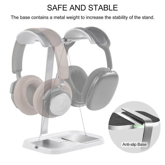 Stable: Wide base has anti-slip design for excellent stability. Note: when you place the headset stand on the desk please be sure the desk is flat and dust free.
