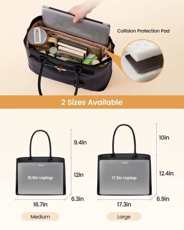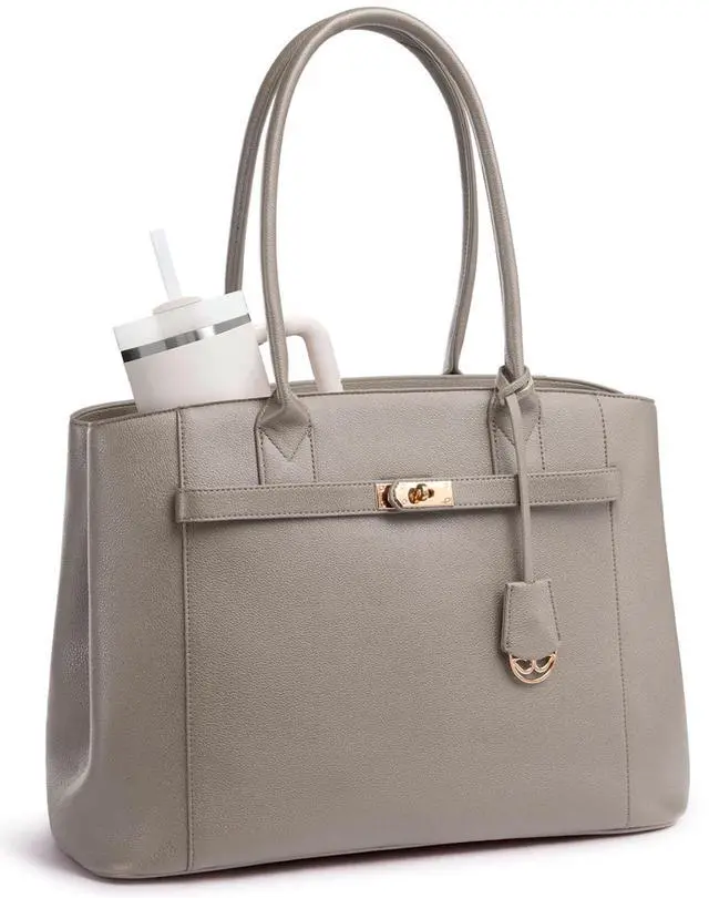Fashion InnovationSignature cross-bar metal clasp, dangling metal logo charm, Stanley cup pocket, and convertible silhouette ^^ Dimensions 17.3" x 6.9" x 12.4". Accommodates laptops up to 17.3". ^^ Classic Meets Personal StyleClean, sleek silhouette lines of the tote bag nod to timeless tote appeal, but the horizontal cross-bar hardware and vertical logo pendant add contrast that catches light and compliments. Pair it with a tailored suit for Monday meetings or throw it over a hoodie on Sunday errandsits quiet sophistication adapts to any wardrobe and lets your personality lead. ^^ Spacious Laptop Tote BagComputer bag owns 17.3" laptop pocket + one tablet sleeve (both padded), 2 interior side pockets (one sized for Stanley), 4 different wall pockets, 1 zip security pocket, plus 1 quick-grab external zip pocket.