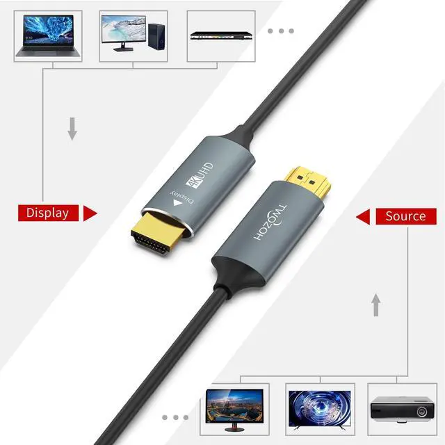 ^^ Durability & Flexible: Twozoh Fiber Optic HDMI Cable is made of high-quality glass fiber, aluminum shell, 24K Gold-plated plug for stable signal transmission and better insulation. ^^ High Decision Multimedia Fiber HDMI Cable uses high-quality photoelectric conversion module at both ends which can convert electrical signals into optical signals, without any delay and attenuation by optical signal transmission. ^^ 4K Fiber