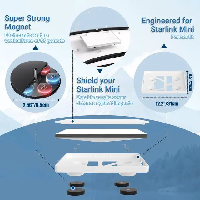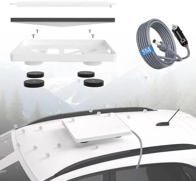 Strong Magnetic Base with 5m Car Charger Equipped with 4 high-strength rubber-wrapped magnets (220 lbs pull force), this starlink mini magnetic mount attaches securely to any flat metal surfacea true no drill car mount. Includes a 5-meter car charger for Starlink Mini for stable power in trucks & RVs. ^^ All-in-One Protective & Cooling Design This Starlink Mini mount features a full-enclosure cover that shields from hail & debris. Bottom cooling vents + UV-resistant polycarbonate keep your Starlink Mini safe and cool in all weatherideal for outdoor internet setup. ^^ Quick Install & Universal Fit Install in seconds on any clean metal surface.