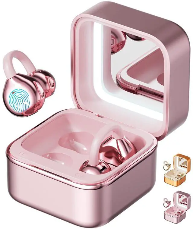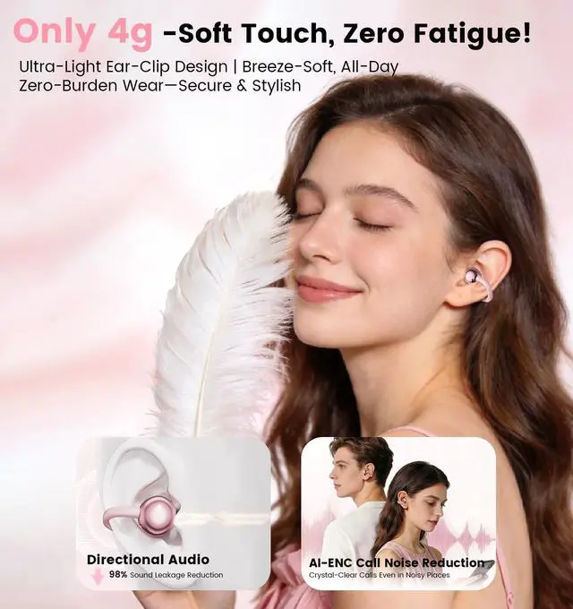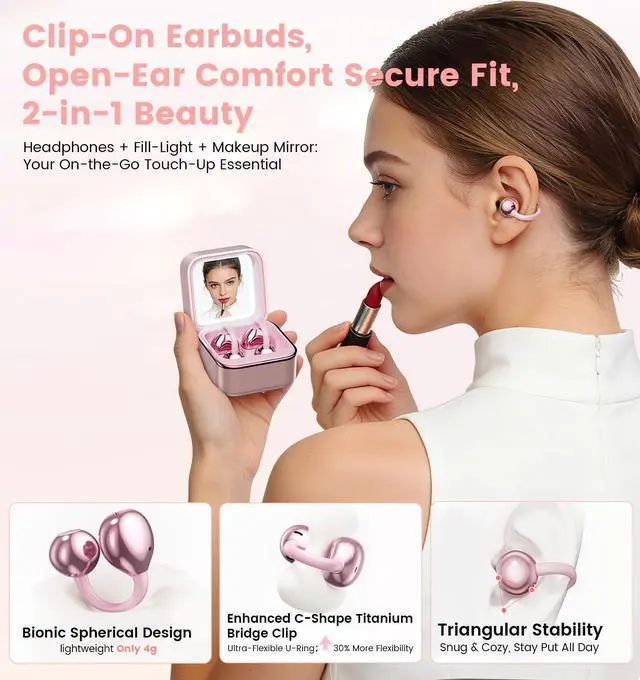 Beauty Buddy: Enjoy all-day zero-pressure listening with our upgraded C-Shaped titanium Bridge clip earbuds with ultra-lightweight bionic spherical designjust 4g per earbud! It fits all ear shapes snugly, even over glasses. The game-changer? A built-in portable makeup mirror with soft fill light. These open ear clip-on earbuds arent just for musictheyre your on-the-go beauty must-have, perfect for quick touch-ups anytime, anywhere. ^^ Crystal Clear Calls with AI-ENC & 98%+