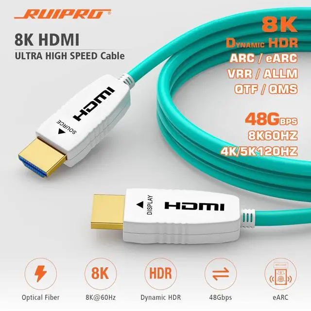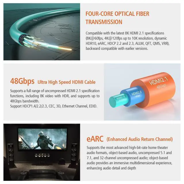 HDMI Cable: Supports the full range of uncompressed HDMI 2.1 Specification features including 8K video with HDR, Enables up to 48Gbps bandwidth ^^ Supports the most advanced high bitrate home theater audio formats, object-based audio, uncompressed 5.1 and 7.1, and 32-channel uncompressed audio; Object-based audio provides an immersive multi-dimensional experience and enhanced audio detail and depth ^^ Wide Compatibility for