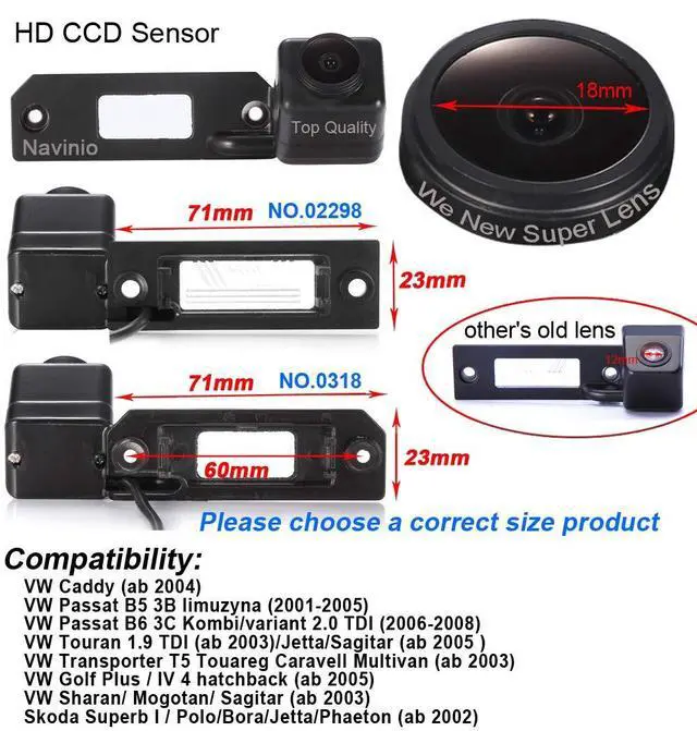 Dear customer, Please must check the camera size and appearance before place a order, see if can fit your car license plate lamp place size and appearance! Because the same car model in different countries may have some difference, please check the camera size and compare the installation of your car carefully to avoid mistake. This product could fit for all below models as expected: replacement for VW Caddy (ab 2004) Passat B6 KOMBI/VARIANT (2006-2008) Passat 3C (ab 2003) Passat B5 Limuzyna (2001-2005) Passat 3B (ab 2001) Transporter T5 (ab 2003); Replacement for Touran 1.9 TD (ab 2003) Jetta (ab 2005) Golf 4 IV hatchback Golf Plus (ab 2005) Sharan Passat variant 3C/B6 model 2.0 TDI 2007Skoda Superb /Polo/ Touareg-