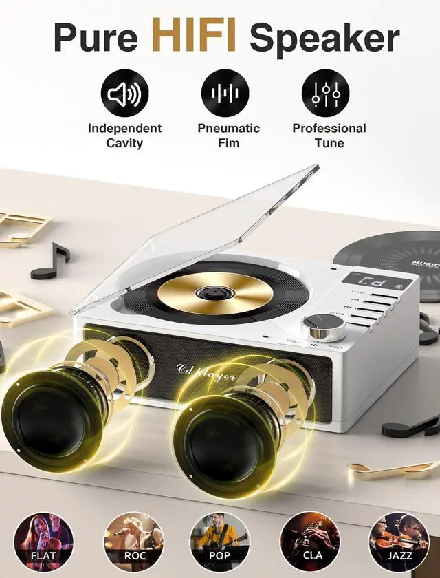 (Note: This CD player cannot connect to the car's Bluetooth. ) ^^ 4000mAh Rechargeable BatteryThis desktop CD player for home has a built-in 4000mAh rechargeable battery that can be charged using the included type-c cable. It only takes 7 hours to fully charge and can last up to 19 hours. This rechargeable CD player weighs only 1.65 lbs, with the size of 7.56 * 5.98 * 2.76 inch making it very convenient to carry outdoors. ^^ Good Sound QualityThe built-in dual speakers bring a surround sound to this multi-functional retro CD player, effectively restoring the quality of CDs. It provides excellent clarity, allowing you to enjoy a pleasant listening experience. This CD player with speakers has 5 built-in music equalizers: FLAT, POP, JAZZ, CLASSIC, and ROCK, allowing you to switch to your favorite music style as you please. ^^ Multi-functional CD Music PlayerThis CD player portable has 5 modes: CD Mode, Bluetooth Mode, USB Mode, TF Card Mode, so we can switch between the modes we need. Beside, it has A-B repeat mode is perfect for learners because it allows you to replay CD audio intervals as needed. The portable cd player will turn off automatically after 15 minutes of no operation. ^^ The Perfect Gift with Premium Customer ServiceThis retro CD player is undoubtedly the perfect gift for your music-loving friends. The buttons and knobs are easy to adjust. Our portable CD player with bluetooth comes with 12 months of after-sales service and friendly customer support, providing world-class customer service around the clock. We are committed to taking 100% responsibility for our customers and products.