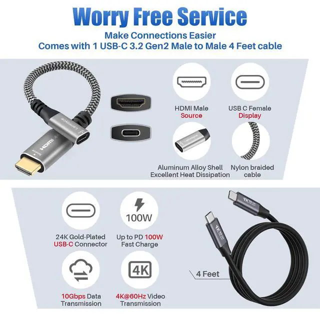 Worry Free Service: To enable you to make the best use of the adapter performance, we provide 1 USB C to C 4-feet cable for easy connection. USB C cable supports 4K@60Hz Video, PD100W and 10Gbps data transmission and We offer a 12-month worry free warranty and friendly customer service for this 4K USB C to HDMI adapter and USB C cable. If you have any questions, we will resolve them within 24 hours.