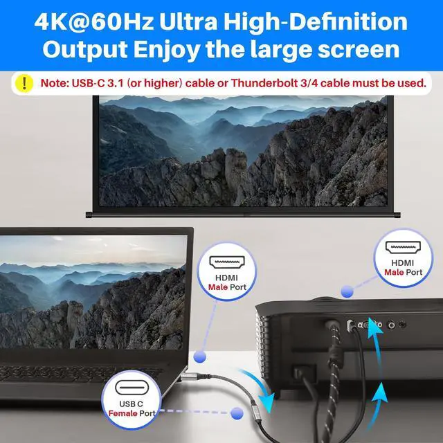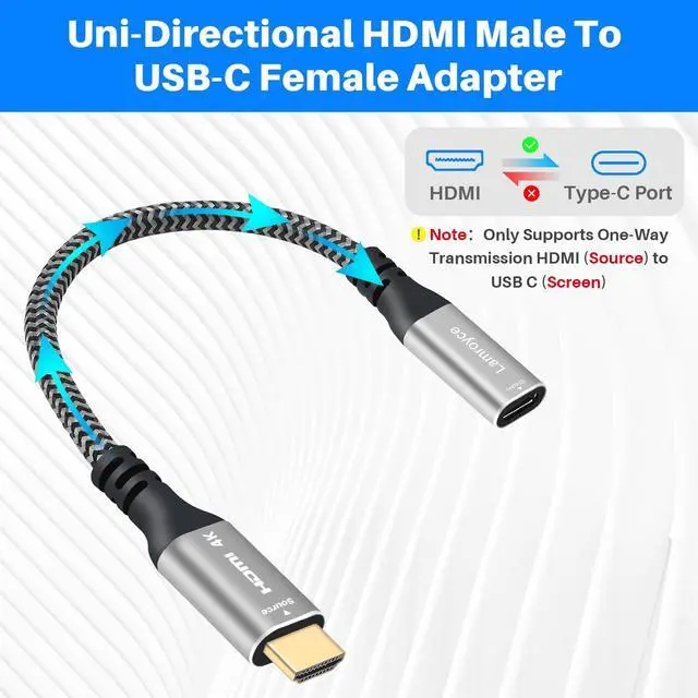 Please Note: The adapter is unidirectional, effortlessly converting HDMI Port (source) input to USB C Female (Display) output. The HDMI Plug of the adapter cable must be connected to the source device for signal transmission (such as laptops, desktop computers, PC), and connect the USB Type-C female port of the adapter cable to the USB C Monitor (such as Monitor, Projector) through a USB C cable. Note: When using the USB C female port to connect the Monitor, please ensure that your USB Type-C cable version requires USB 3.1/4.0/Thunderbolt 3/4 and supports video transmission function.