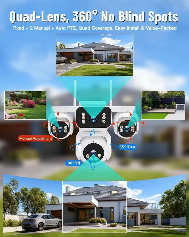 4-Lens 360 Pan-Tilt, Total Coverage with No Blind Spots Equipped with four lenses (2 manually adjustable, 1 PTZ lens, 1 fixed lens) this outdoor security camera enables real-time simultaneous monitoring of multiple areas. You can remotely control the PTZ lens for 355 horizontal pan and 90 vertical tilt through the app (HiEasy), flexibly keeping an eye on every corner of your home, garden, driveway or garage. The manually adjustable lenses focus on key areas, and 360 full coverage erases blind spots in your surveillance range ^^ Wireless Data, Wired Power for Stable 24/7 MonitoringThis camera uses WiFi for data, so no Ethernet cable is needed.
