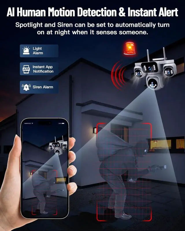 It pairs quickly with your phone for remote liveview and control. Powered by the included adapter (plugin, not batterybased) it provides continuous monitoring and is ideal for indoor/outdoor locations with power access ^^ AI motion detection & auto trackingEquipped with AI human detection, it reduces false alarms from fall leaves, branches and pets. This camera efficiently identifies and automatically tracks potential intruders, instantly activating both spotlight and siren upon detection. Once human motion detected, real-time alerts are sent directly to your phone, allowing you to stay informed wherenever you are, ensuring your family, property, and valuables stay safe without missing any important moments ^^ Triple-Mode Smart Night VisionAdapt to any lighting with three distinct vision modes: Full-Color mode for vivid footage in low light, Smart mode that uses AI human detection to activate color recording only when needed, and Infrared mode for clear imaging in total darknessensuring your outdoor security camera delivers detailed, 24/7 monitoring day or night ^^ 2-Way Audio & Multi-user Sharing You can communicate from anywhere by using the 2-way audio function of our camera, not only can deter the intruders, also is convenient to communicate with parcel carriers or visitors. This home surveillance camera supports multi-user login. You can share camera access with your family members, allowing everyone to live view and playback footage simultaneously ^^ Flexible Dual Storage & Efficient CompressionSave recorded footage conveniently through dual optionslocally to a microSD card (supports up to 256GB, 256GB card not included, but 32GB card included) or securely to the cloud (subscription optional). Equipped with H. 265 video compression, the camera maintains high video quality while optimizing storage space, giving you both flexibility and efficiency ^^ IP66 Weatherproof & Durable DesignCrafted with an IP66 waterproof and dustproof ABS shell, this camera withstands rain, snow and extreme temperatures ranging from -4F to 122F, delivering reliable performance in harsh weather all year round, whether stormy winters or scorching summers ^^ Easy Setup & Flexible Mounting With versatile placement options for ceilings, walls, and corners, this dome camera is ideal for monitoring front doors, yards, garages, shops, and more.