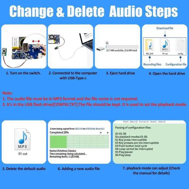 The maximum recording time is 16 minutes. Can download your own mp3 music, also record through MIC. You can connect to the computer to delete built in music. Personalize your settings by adjusting the playback mode (PLAY=01-02) and (IO=01-06) parametes, If you want to adjust the volume. you can adjust on the module volume button. This allows you to achieve a personalized experience. ^^ 16 MB Storage Capacity This sound module boasts a spacious 16 MB memory, providing ample storage space to accommodate multiple favorite songs or recordings. By connecting the module to a computer using a USB-Type-C cable, you can effortlessly add new audio files to the internal storage.