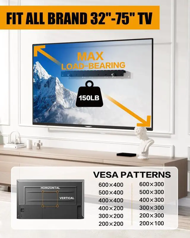 Fits 32 to 75 Inch TVsHYPIGO no stud tv wall mount compatible with most TVs from 32 to 75 inches with VESA patterns from 100x100 mm to 600x400 mm. These VESA measurements refer to the spacing between the four mounting holes on the back of your TV ^^ Easy 10 Minute InstallationThe tv hanger wall mount includes screws for multiple TV brands and clear step-by-step instructions. All hardware is provided, plus a bubble level to help you install the mount smoothly by yourself in just minutes ^^ Durable Aluminum Alloy BuildThis no drill tv mount is made from premium cold-rolled aluminum alloy for long-lasting strength and stability.