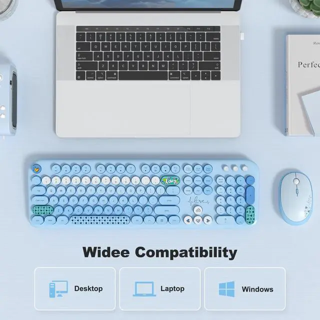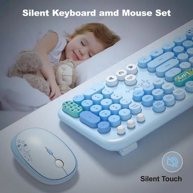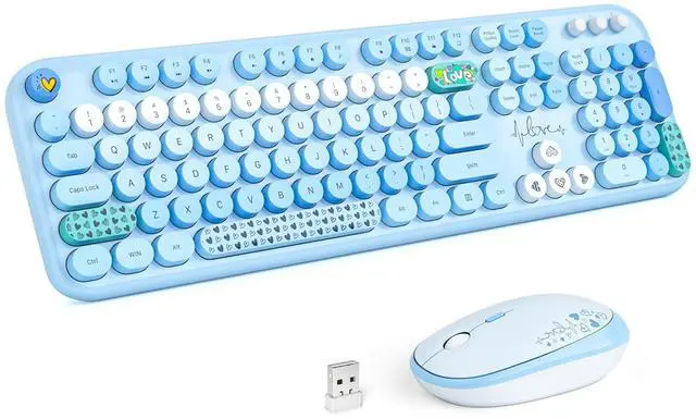 Wireless Keyboard and Mouse Combo, MOWUX Full Size Typewriter Retro Round Computer Keyboard, Cute Optical Mouse Wireless, Plug and Play, for Laptop, PC, Computer- Blue Heart