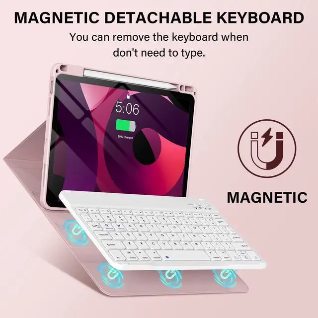 Wireless Keyboard: The magnetic bluetooth keyboard and case are separated, magnetically attached, the keyboard can be removed from the case. The keyboard can be attached to the case magnetically, if not needed, it can be removed. You can take keyboard case to anywhere anytime after 2-3 hours full charged with built-in long life rechargeable Lithium-ion battery ^^