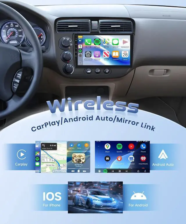 Mirror Link: For 2005 Civic radio supports wireless CarPlay and Android Auto connection via Bluetooth and USB. Support mirror link, Project your phone's content onto the large screen of the head unit, and you can share your favorite 1080P videos, HD pictures, etc. Easily access your phone via Voice assistant control to make calls, navigate, play music, or manage other apps ^^