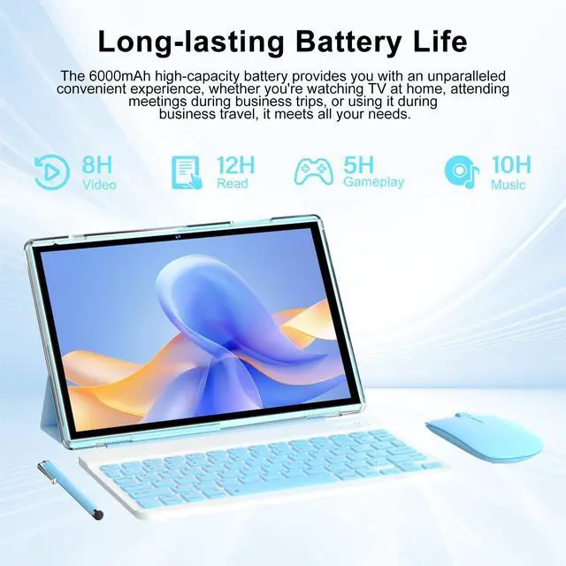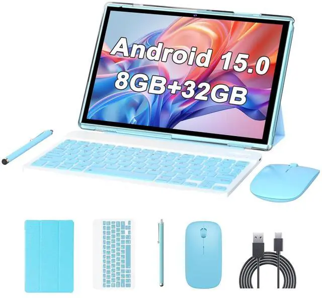 10 Inch Android 15 Tablet2 in 1 tablet with keyboard, a complete bundle that includes everything you need: a detachable keyboard case, stylus pen, wireless mouse, protective case, and charging cable. This versatile 2-in-1 convertible tablet is powered by the latest Android 15 OS for a smooth, modern experience. With 8GB of RAM (3GB + 5GB expansion) and 32GB of storage, enjoy seamless multitasking for work, study, and entertainment. The large 6000mAh battery ensures all-day power, while advanced Wi-Fi 6 ( 2.4G /5G dual-band) guarantees fast, stable connectivity. Key features also include a dual-camera system (2MP + 8MP) for video calls and photos. It's the perfect ready-to-use kit, offering exceptional value and performance right out of the box.