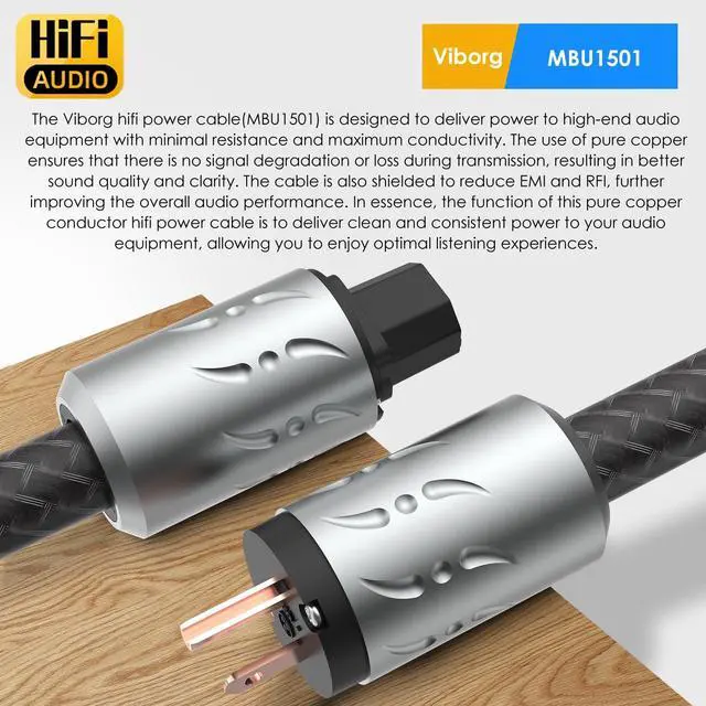 Enhanced audio performance- This Hi-end Power cable is designed specifically for audio applications, providing a clean and uninterrupted power supply to your equipment. The oxygen-free copper conductor and 100% copper shielding minimize interference and maximize signal integrity, resulting in improved audio quality. This power cable is perfect for audiophiles who demand high-fidelity sound reproduction. ^^ High-quality, durable construction- The Viborg MBU1501 Hifi Power cable is crafted with high-end materials for optimal performance. The conductor is made of oxygen-free copper (OFC), ensuring excellent conductivity and reducing signal loss. The cable is sturdy, thick, and not too flexible, providing stability and longevity.