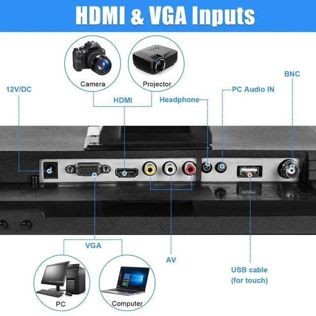 ^^ Practical for you: The 10-bit monitor is highly compatible and supports various interfaces, including VGA, HDMI, AV, BNC and USB (the mentioned USB is different from the USB touch interface). Supports Windows 2000 SP4/XP, SP2/Vista, 32 bit/Win7/LINUX/Win8/Win10 and can be connected to PCs, laptops, cameras and Raspi etc. ^^
