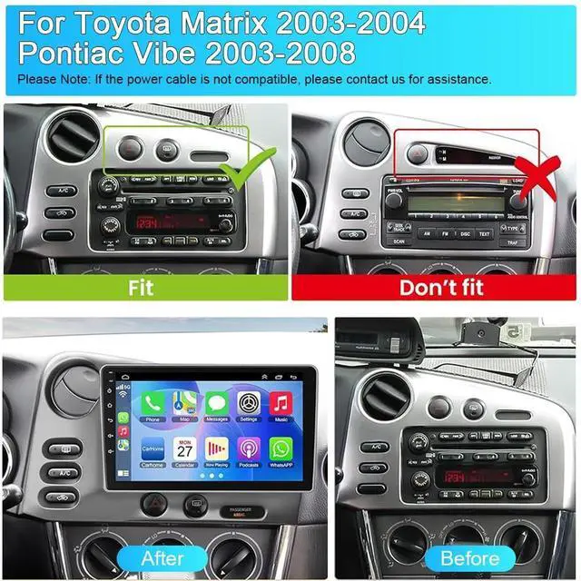 FitmentOur HD car radio stereo is specifically designed for Toyota Matrix Radio Pontiac Vibe Radio 2003-2004 with 9 inch touch screen radio, ensuring a fit and seamless integration with your vehicle. Please check the year, dimensions and shape of the center console of your vehicle before purchasing ^^ Android 13.0 System & Car Radio Multimedia PlayerCar radio player has the latest Android 13.0 operating system 4GB (RAM) +64GB (ROM), powerful core processor, ensures smooth operation and faster response. Our 9 inch touch screen stereo has a larger and clearer screen, giving you a wonderful visual experience.
