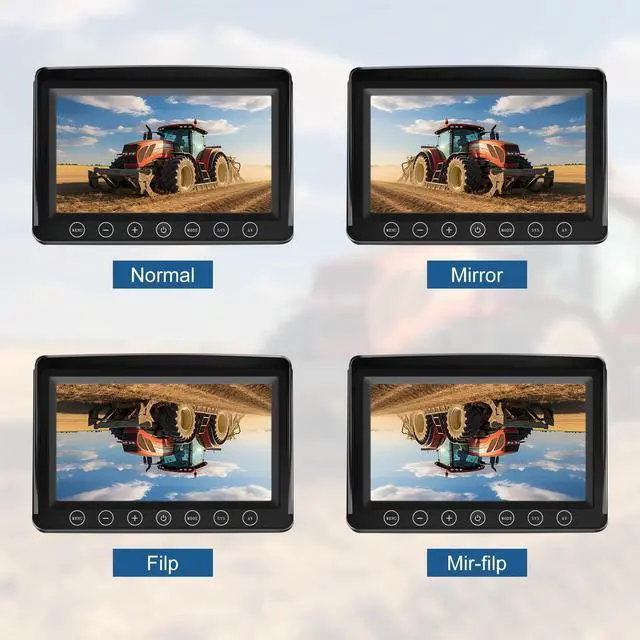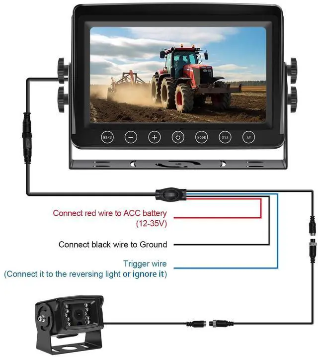 Flexible Vehicle Compatibility: This backup camera has a voltage range of 9-35V DC power supply with a U-shaped metal bracket and is suitable for a variety of large vehicles, such as buses, box trucks, pickup trucks, garbage trucks, flatbed trucks, dump trucks, street sweeper trucks, refrigerator trucks, motor homes, vans, skid steers, farm tractors, combines, cotton pickers, crop sprayers, bulldozers, snow plows, forklifts, excavators, heavy equipment, etc. ^^ MONITOR7 color monitor with U-type metal bracket and with 1080P resolution. It is not waterproof. It is compatible with most of the vehicles with a free power input range DC12-24V and supports with max 2 cameras. TVS and ESD device is built in to protect the monitor from being damaged by the transient high power of vehicles and the electro static as high as 8kv. And this monitor only supplies camera which is in use with DC12V, it saves energy. ^^ HEAVY DUTY CAMERAIt is color camera with the resolution of 1080P, provides super clear and real color image. The viewing angle is 120 degree.