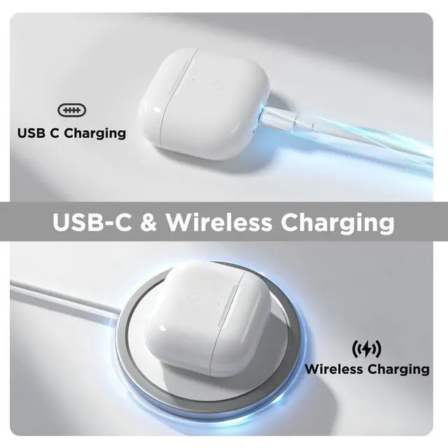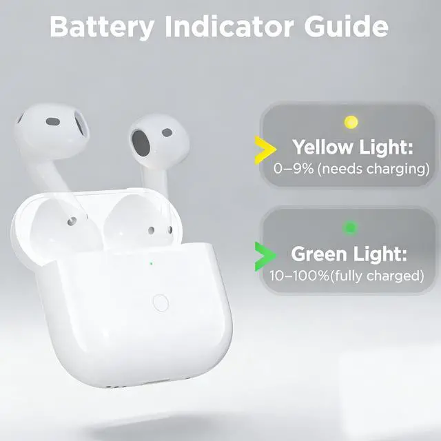 Wireless Dual Charging: Power your AirPods 4 case via modern Type-C cable (full charge in 3 hours) or Qi wireless charger, with intuitive LED indicators that clearly display power status: green light for 100%-10% battery level, orange light when battery drops to 9%-0%, and a white light that activates during Bluetooth pairing when holding the button (replacing the double-tap function in sensor-enabled models).