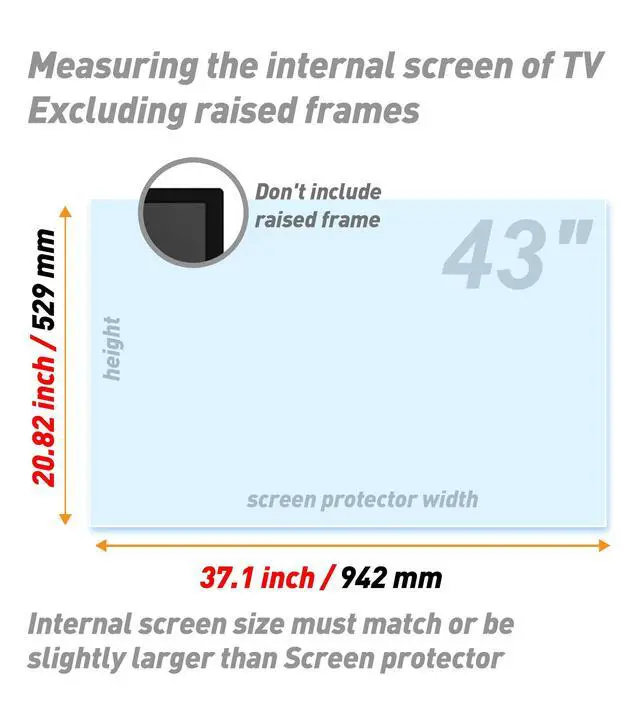 Be sure to confirm the size is suitable: Before purchasing, you must compare the size chart, the size of the protective film needs to match the size of the internal screen of the TV, suitable for most of the 43-inch screen, incompatible narrow bezel 43 inch TVs ^^ Anti glare and anti glare reflection: The protective film has an anti glare matte coating, which can reduce some of the visual interference caused by screen glare and reflection, outdoor use TV must be under the shadow ^^ Relieve eye fatigue, help