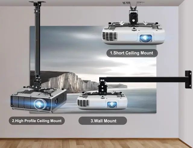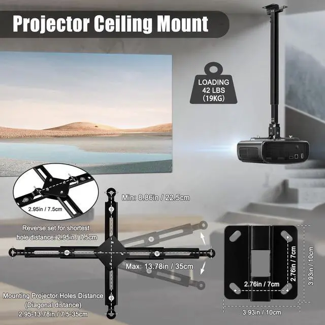 Stability & Durability - Made of premium cold-rolled steel, projector ceiling mount features with a reinforced structure for bigger loading capacity. Support projectors up to 42 LBS (19KG). 3 in 1 retractable projector mount, including flush ceiling mount, telescoping arm ceiling mount, and wall mount. ^^ Easy to Adjust - The ceiling projector mount is adjustable for wider holes distance range 8-14 in / 20.5 - 35.5 cm of a projector. Flexible 60 rotation and 15 tilt. All these are just for a better viewing angle to meet your specific projections needs every time.