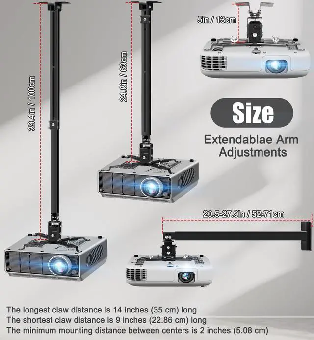 ^^ Modern Design - The projector mount for ceiling features with a modern gloss black finish, which is stainless and provides a stylish look that complements any environment. Whether it's in a conference room, living room, classroom or office, our projector mounts will fit it well. ^^ Extension Height / Length - As projector drop ceiling mount with height from 24.8 - 39.3 in / 63-100 cm. As projector wall mount with length from 20.5 - 27.9 in / 52-71 cm.