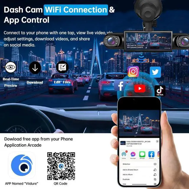 When the built-in memory reaches its maximum capacity, the oldest unlocked footage will be overwritten to ensure infinite loop recording. ^^ Built-in 5G WiFi and APP ControlThe dash cam features built-in WiFi for seamlessly connecting the dash cam front and rear inside to your smartphone, allowing for immediate use once connected. It supports APP both Android and iOS devices. Through the APP, users can effortlessly preview, download, and manage videos in real-time using the "Viidure" application. Also, you can turn on the GPS function in the app, records the driving route, real-time speed, location, etc.