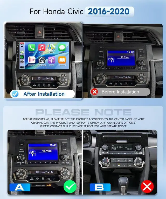 for Honda Civic Radio & Qualcomm ChipThis car radio is compatible for Honda Civic 2016 2017 2018 2019 2020 Radio and features a plug - and - play wiring harness. Equipped with Qualcomm's 8-core processor and Android 13 OS, this car stereo delivers superior processing power with 4GB RAM + 64GB ROM for zero-lag operation. ^^ Wireless Carplay & Android Auto Radio support seamless wireless CarPlay & Android Auto connectivity supports latest iOS/Android versions. Directly access navigation apps (Waze, Google Maps), streaming platforms (Spotify, YouTube Music), and communication tools via the responsive 9-inch display.