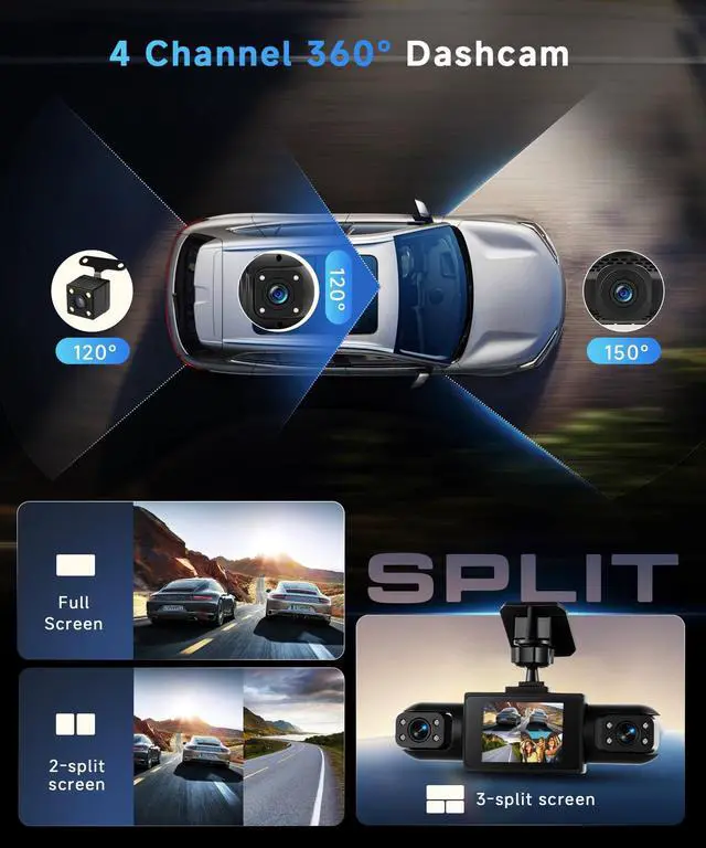 High-Definition Image Quality Dash Cam equipped with a 1080p resolution, it precisely captures license plates, road signs, and other information while driving, providing a clear visual experience and laying the foundation for recording driving details, providing clear footage in critical situations. ^^ Full-Range Camera Coverage Dash camera for cars features four cameras, the front two lenses can flexibly adjust the shooting angle to capture more details and easily achieve 360-degree coverage, ensuring no blind spots around the vehicle and preventing information from being missed due to loss of perspective. ^^ Intelligent Loop Recording & Key Protection Dashcam features a loop recording function, it automatically overwrites the oldest video when the SD card is full, while locked videos remain(The package does not include a TF card; it must be purchased separately and only compatible with genuine C10 high-speed cards).