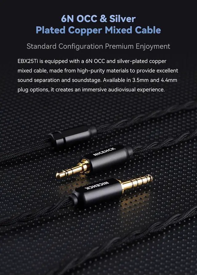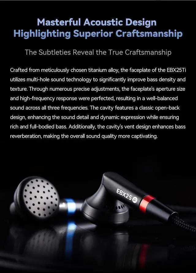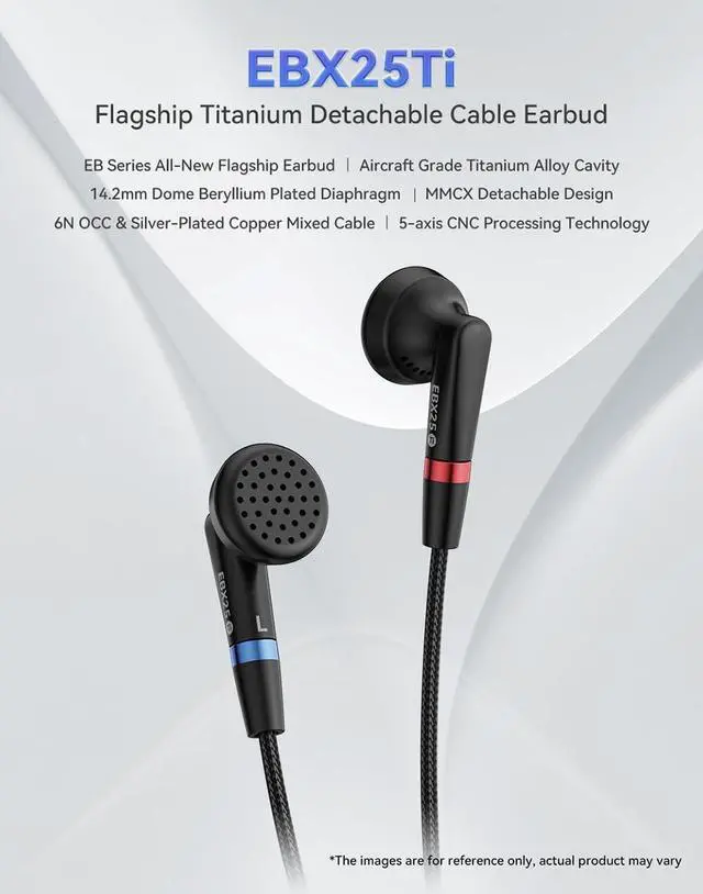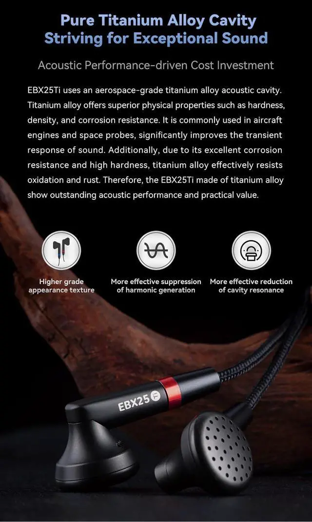 Aerospace-Grade Titanium Alloy CavityAwarded VGP 2025, the EBX25Ti flagship titanium alloy cavity dynamic earbud wired headphones offer durability, corrosion resistance, and low distortion, delivering clear sound for audiophiles and earphones for musicians ^^ 14.2 mm Dome Beryllium-Plated Diaphragm 14.2 mm beryllium-plated diaphragm powers these in ear monitor units, producing powerful bass, clear mids, and crisp highsideal for immersive music, iem gaming, and live performance use. ^^ Premium 6N OCC & Silver-Plated Copper CableThese wired earbuds include a premium 6N OCC and silver-plated copper MMCX detachable cable, ensuring excellent separation, wide soundstage, and accurate reproduction for in ear monitor earphones and studio sessions.