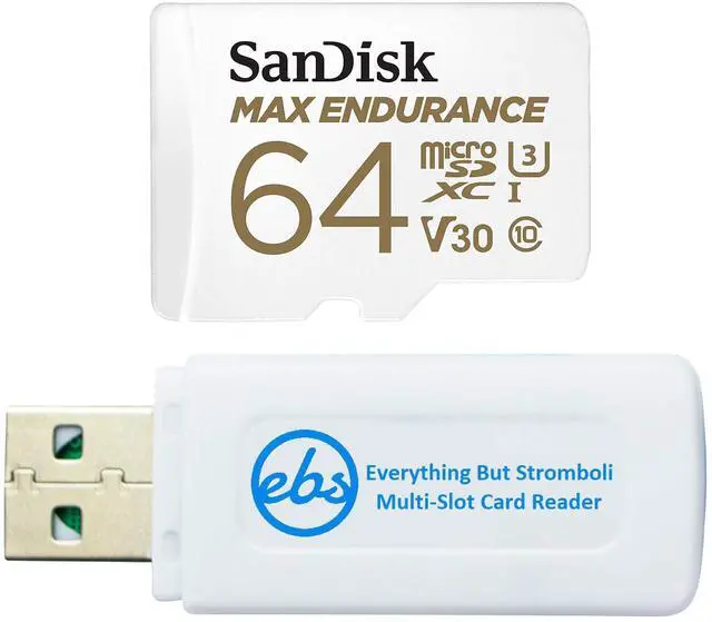 Bundle includes (1) 64 GB microSD SanDisk Max Endurance memory card with adapter and (1) Everything But Stromboli Multi-Slot Card Reader - Includes SD, Micro SD, M2, and MS slots for easy transfer.