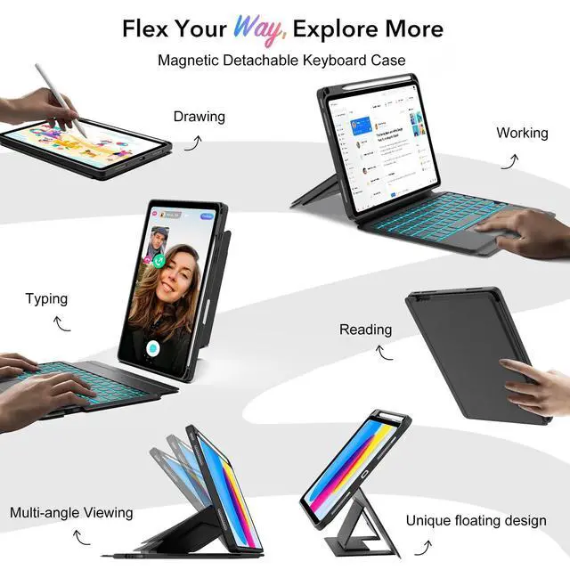 Magnetic Detachable Keyboard Case Stand:The ipad keyboard and protective cover adopt a magnetic separation design, allowing for easy disassembly and connection.The central magnetic area is strong, allowing you to combine the protective cover and keyboard for daily work, study, and life. When the case and keyboard are separated, you can enjoy portrait mode, drawing mode, reading mode, and freestyle mode. Switching between iPad and Laptop modes becomes effortless