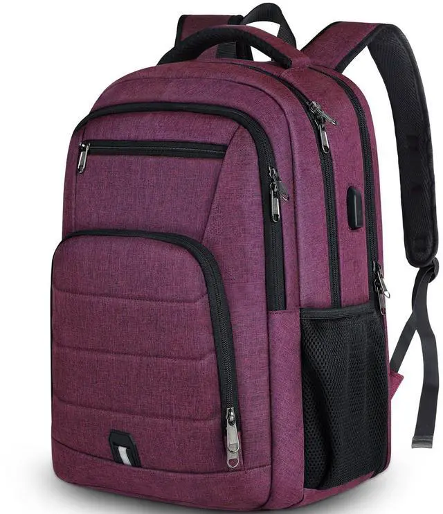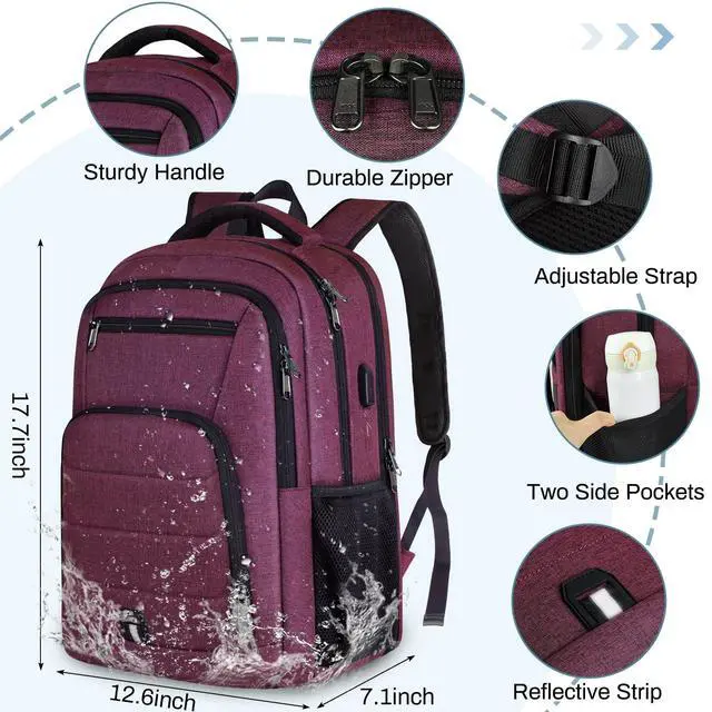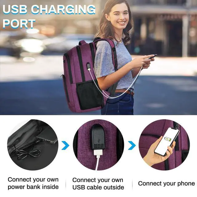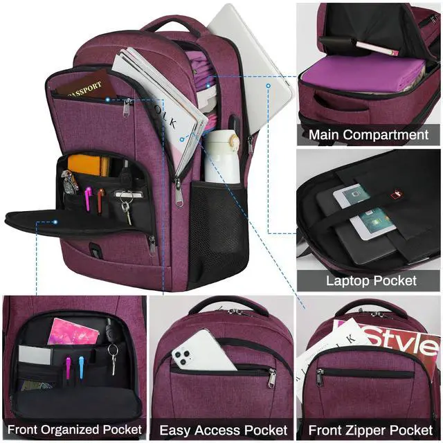 LARGE CAPACITY & SPACIOUS POCKETSThis laptop backpack for women has lots of pockets for well organization. One separate laptop compartment can fit a laptop up to 17.3 inch. One main packing compartment roomy for daily essentials and tech electronics accessories. 1 organized compartment with hidden pockets and pen pockets. 2 side mesh pockets. 2 front zipper pockets. 1 back anti-theft pocket. ^^ USB CHARGING PORT & TSA FRIENDLYExternal USB port with built-in charging cable offers a convenient way to charge your cellphone while walking. Designed exclusively for airplane flight travel, the travel backpack can be opened up to 180 degrees for scanning easily, making it getting through airport security checkpoint more quickly.