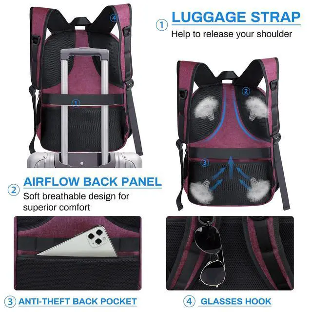 ^^ COMFORTABLE & PRACTICALDurable back pack with soft & padded back, adjustable breathable mesh shoulder straps, which help to relieve the stress from your shoulder. Both shoulder strap with lanyard design, can hang sunglasses and other small items. 1 back luggage strap allows this computer backpack slide over suitcase tube for easier carrying. The front reflective strip of the laptop backpacks makes it safe to travel at night. ^^ WATERPROOF & DURABLE MATERIAL17 inch backpack for women is made of water-resistant and scratch-resistant polyester fabric, which protects your inner items from getting wet on drizzle days.