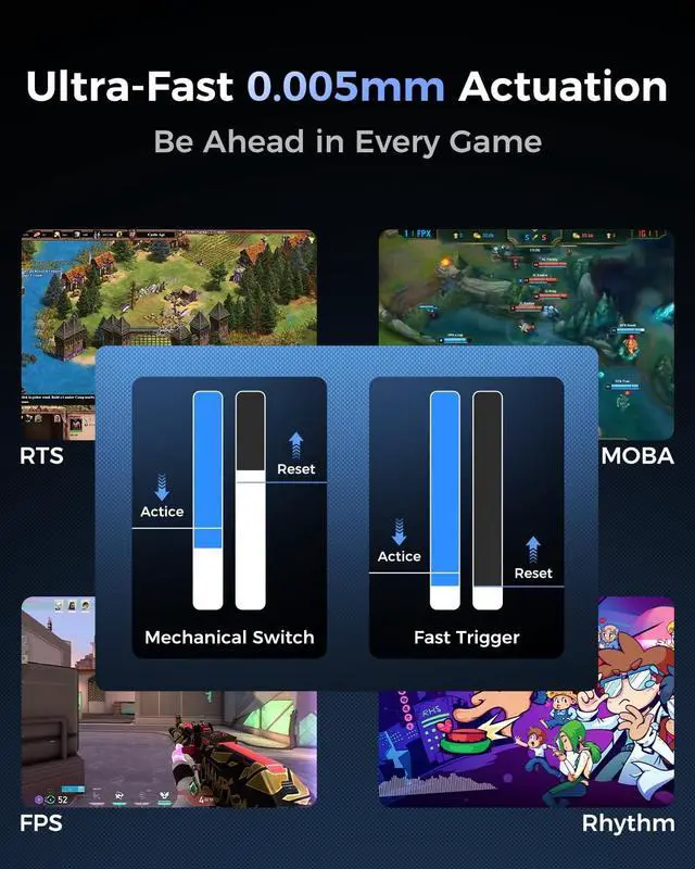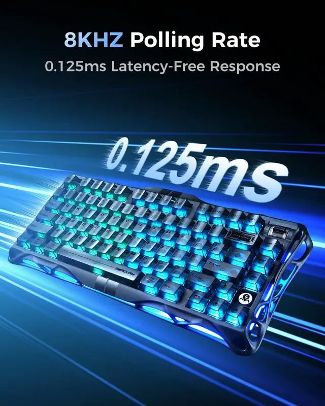 Hall Effect Magnetic Switches for Precision Control -- Advanced Hall Effect technology provides lightning-fast 0.005 mm sensitivity and adjustable actuation points ( 0.13. 6mm), giving you full control over every keystroke. ^^ 8K Polling Rate for Lightning-Fast Response -- Experience ultra-low latency with an 8000Hz polling rate and 0.125 ms response time, giving you a competitive edge in every keystroke. ^^ Compact 75% Layout with Hot-Swappable Switches -- Enjoy a streamlined 79-key layout with full arrow/function row support and easily replace switches without soldering. ^^ Customizable via Software for Total Control -- Personalize key actuation points, lighting effects, and macros using GravaStars intuitive softwareengineered for pro-level performance tuning.