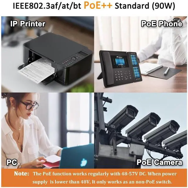 [IEEE 802.3 af/at/bt PoE+ Standard]The Ethernet Switch supports IEEE 802.3 af/at/bt PoE+ (90W), meeting the needs of power supply better. ^^ [Gigabit Fiber to Ethernet Switch]The RJ45 ports and SFP ports all supports 1000Mbps network transmission, 10-port design meet more needs of collocation use. ^^ [48~57V DC Power Input]The Ethernet Switch requires 48~57V DC power input, In this way, its poe function can be used smoothly. ^^ [20Gbps Backplane Bandwidth]It has 20Gbps Backplane Bandwidth and 9K Bytes Jumbo Frame, Supporting non-blocking forwarding transmission. ^^ [IP40 Al Case]The Ethernet switch adopt industrial IP40 Al Case, having 6KV lighting protection and can work at wide range temperature -40C to 80C (-40F to 176F).