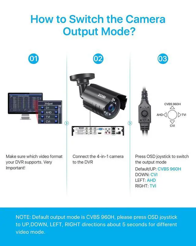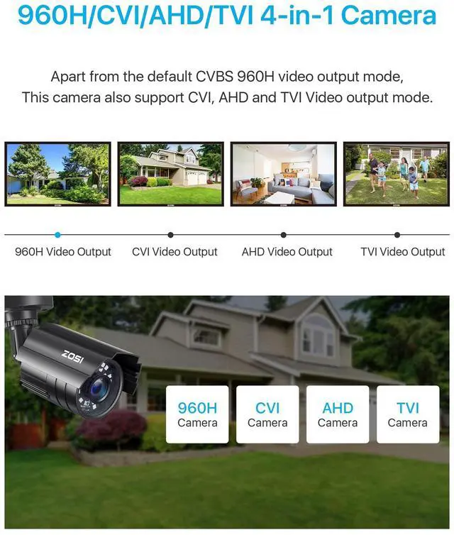 2MP HD 1080P 4-IN-1 Security CameraThis is 4-in-1 TVI/CVI/AHD/CVBS bullet camera. It is compatible with 960H, 720P, 1080P, 3MP, 5MP, 8MP, 4K HD-TVI, AHD, CVI, and CVBS/960H analog DVRs. ^^ Bulit in OSD MenuIt comes with OSD Menu which can change 4 different video output, 1080P AHD, 1080P CVI, 1080P TVI and 960H CVBS. The default video mode is 960H mode, compatible with all analog DVRs. The 1080P video mode needs to be switched according to your 1080P DVR type.