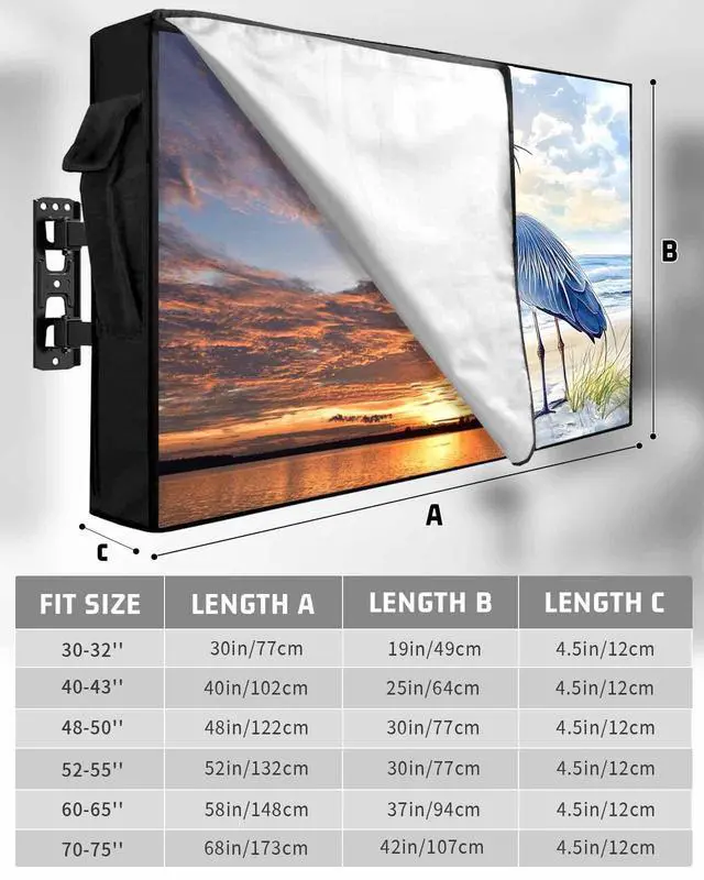 Outdoor TV Cover Size Chart30-32in /30x19x 4.5 in32 in smart tv40-43in /40x25x 4.5 in43 inch smart tv48-50in /48x30x 4.5 in50 inch tv52-55in /52x30x 4.5 in55 inch tv60-65in /58x37x 4.5 in65 inch tv70-75in /68x42x 4.5 in75 inch tvOutdoor TV Protector DesignFull coverage design avoids damage from the vivid elements, making your outside television always look like new. Warm TipsPlease measure the size of your TV accurately before purchasing a TV cover. Store the remote in the cover pocket. When youre ready to switch off and head indoors, always remember to place the remote inside its pocket on your outdoor TV cover.
