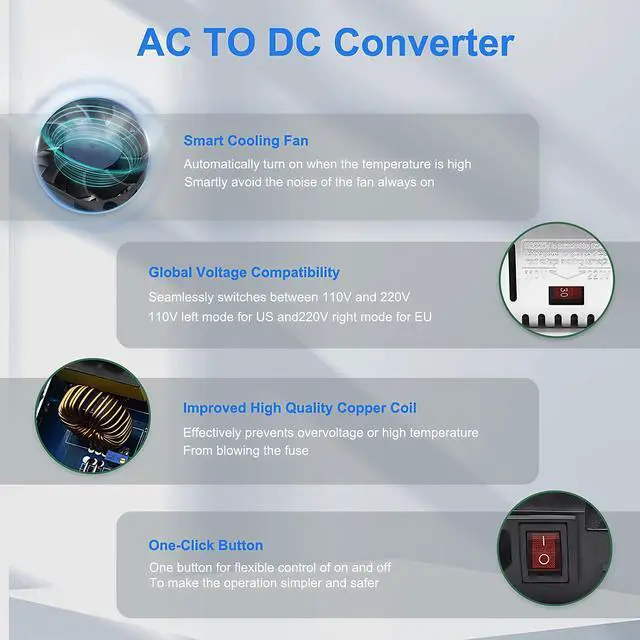 One-Click button and Multiple ProtectionsThe 12V power supply is designed with an eye-catching red one-button switch that makes power on/off operation safe and easy. Meanwhile, we have equipped the 110 to 12 volt converter with multiple protection functions, including short-circuit protection, overcurrent protection, overload protection, and overtemperature protection. All of these protections ensure that the device can be protected in a timely and effective manner when faced with various potential risks.