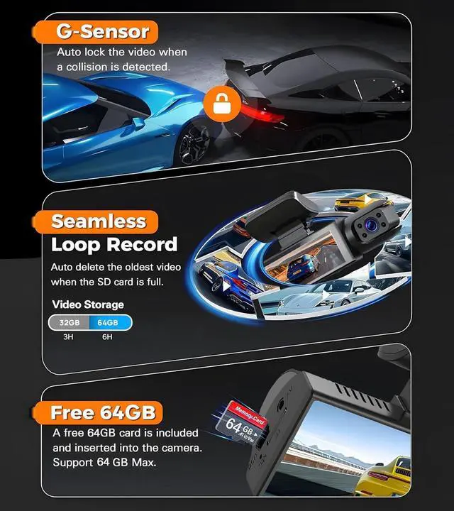 Dash Cam Front and Rear Inside,Dashcam for Cars with APP Control,Car Camera Driving Recorder with 64G Card IR Night Vision,Loop Recording,3.16 Inch IPS Screen,Parking Mode (Front+Inside+Rear)
